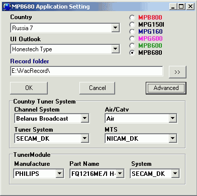 В появляющемся при первом запуске окне настроек на вкладке Advanced выбираем Belarus Broadcast (настройка по умолчанию на Восточную Европу сказывается на поиске каналов самым неблагоприятным образом) и SECAM_DK.