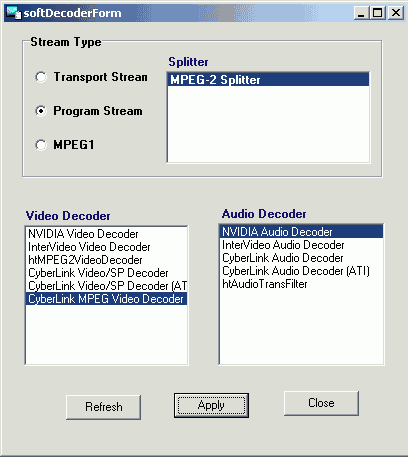 Кнопка Find SoftDecoder открывает окно выбора любого установленного в системе декодера для обработки потока с тюнера (!), причем, возможна работа даже с REALmagic Xcard от Sigma Design Inc. Об использовании декодеров от NVIDIA и ATI я уже и не говорю.