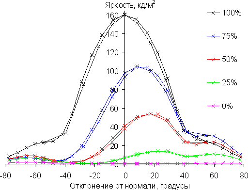 Зависимость яркости полутонов (0% — черный, 100% — белый) в центре экрана от отклонения оси датчика (отрицательные значения — вниз, положительные значения — вверх) от нормали к экрану в вертикальной плоскости