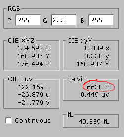 Цветовую температуру мы измеряем при 50, 75 и 100% белого (127, 191 и 255 в окошках R и G и B, соответственно):