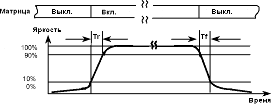 | Чертеж, поясняющий процедуру измерения времен отклика. Tr — время включения, Tf — время выключения |