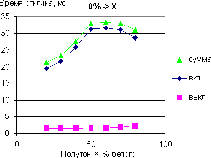 Очевидно, что скорость переключения черно-белых полей играет роль только в одном случае: при прокрутке черного текста на белом фоне. Смазанность объектов при просмотре фильмов и при виртуальном сражении определяется скоростью перехода между полутонами. К сожалению, у ANSI нет методики, описывающей процедуры таких измерений. Поэтому, во-первых, производители матриц и мониторов могут сознательно обеспечивать малые черно-белые времена отклика, не заботясь о полутоновых переходах, и, во-вторых, отсутствие стандартов затрудняет адекватное сравнение скоростей полутоновых переходов, полученные независимыми тестовыми лабораториями. В настоящий момент мы разработали свою методику измерения времен отклика при переходе между полутонами. Мы предлагаем проводить три вида измерений: для фиксированного полутона (X) измерять время отклика при переходе от черного до X, от X до белого, и для перехода между полутонами в окрестности X, отстоящими от X на фиксированное значение (мы выбрали его равным 10%, так как считаем 20% минимальной имеющей значение разницей между полутонами). Ниже для примера приведены полученные зависимости.