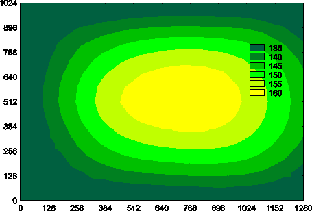 Кроме того, при необходимости мы можем построить аппроксимированные поверхности яркости черного и белого полей и контрастности (отношения яркости белого к яркости черного), чтобы выявить локальные выбросы.