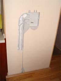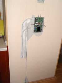 Далее прикидываем и отмечаем место, где мы будем размещать тюнер. К этому вопросу надо подойти творчески и выбрать удобное для себя место отвода проводов от разъемов тюнера. Я расположил устройство так, чтобы разъемы смотрели влево — для меня это было удобно, хотя и не совсем рационально. Учитывая то, что верхняя крышка тюнера будет снята, делаем углубление в стене, примерно на 30-35 мм. Если стена бетонная, то без перфоратора не обойтись. Мне было несколько проще — короб воздуховода из гипса, а он хорошо поддается простой стамеске (учитывая это, силы необходимо было контролировать, чтобы не провалить дыру в шахту).