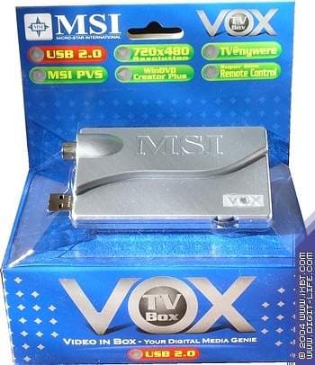 Стремительно развивающийся рынок TV-тюнеров с интерфейсом USB 2.0 не остался без внимания MSI. Не секрет, что габариты играют не последнюю роль в привлекательности таких устройств, а практически все существующие на рынке модели особой миниатюрностью, все-таки, не отличаются. На это и сделали ставку инженеры компании, получив в результате VOX USB2.0 TV BOX — тюнер, без преувеличения, карманного формата.