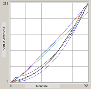 И снова график как близнец с таким же у 90GX2 —тот же равномерный завал по яркости у зеленого и красного каналов и более-менее нормальная яркость у синего. Все это легко выправляется калибратором, что приводит к визуальному «потеплению» изображения (меньше % синего в итоговом сигнале).