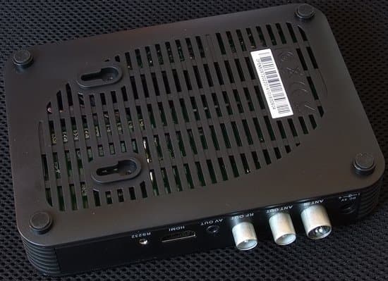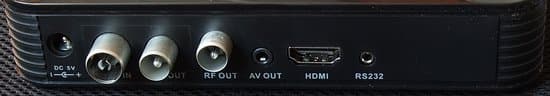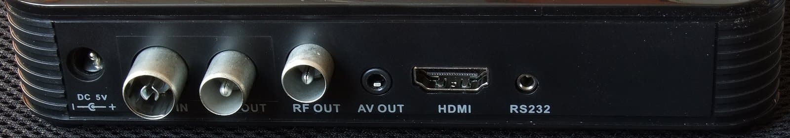На задней панели находятся разъем для подключения питания, входной и выходной антенные разъемы IEC (в отличие от BBK SMP137HDT2, ресивер поддерживает сквозное подключение), разъем IEC выхода модулятора, разъем для аналогового подключения при помощи комплектного переходника, разъем HDMI и крайне редко встречающийся у бытовых устройств разъем RS-232.