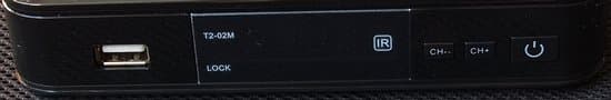 Передняя панель выполнена из маркого глянцевого пластика, на ней расположены разъем USB, зеленый светодиодный индикатор принимаемого сигнала, сегментный информационный дисплей с зелеными светодиодами, ИК-датчик, а также кнопки переключения каналов и включения ресивера.