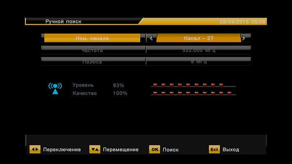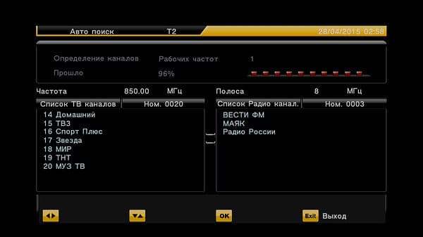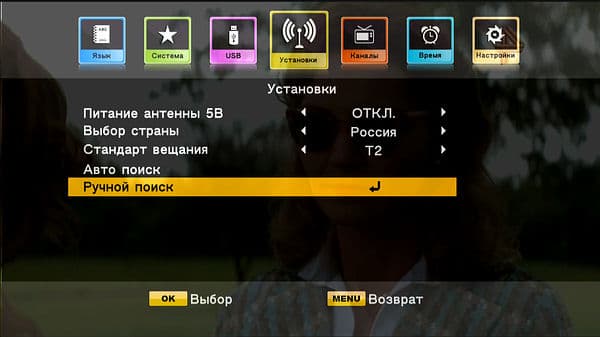 При первом запуске пользователю предлагается выбрать язык меню, регион, стандарт вещания (T+T2, T, T2), включить дополнительное питание антенны и начать поиск программ.