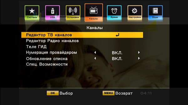 Раздел «Каналы» содержит редакторы телевизионных и радиоканалов, данные электронной программы передач, включение/отключение нумерации провайдера и обновления списка.