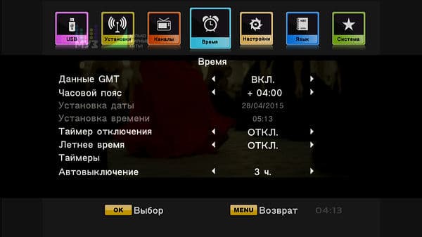 Стандарт DVB-T2 поддерживает передачу времени, в соответствующем разделе можно выбрать часовой пояс, регион, настроить таймер отключения (15, 30, 45, 60, 90, 120 минут), переход на летнее время и автоматическое выключение (от 1 до 5 часов с интервалом в 1 час). Поддерживается установка времени вручную.