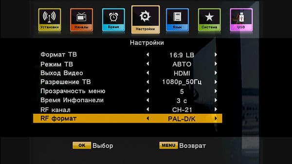 Пункты «RF канал» и «RF формат» относятся к настройке модулятора. Ресивер может осуществлять вещание на любом из каналов с 21 по 69 в стандартах PAL и NTSC с разными поднесущими звука, имеющийся в актуальных на момент тестирования прошивках выбор SECAM является результатом попыток обойти спецификации модулятора и соответствует выбору PAL.