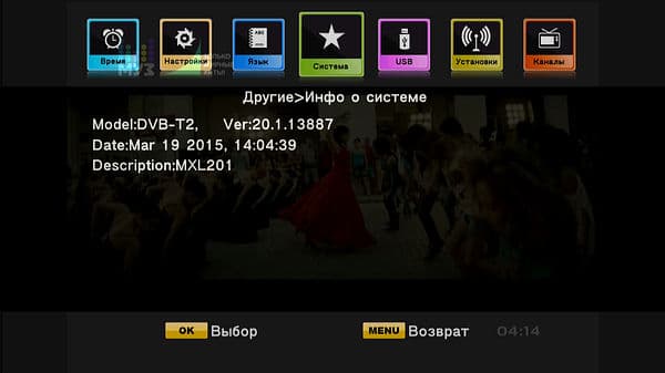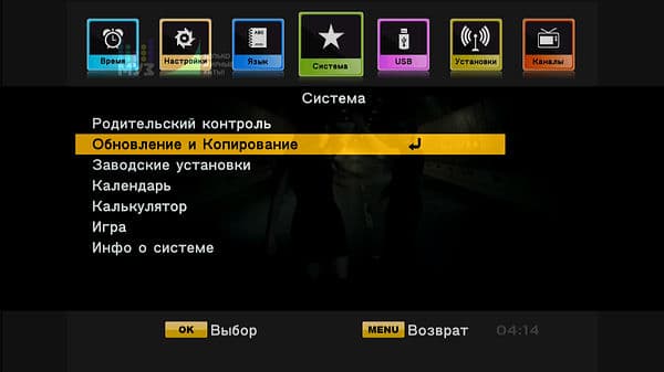 Раздел «Система» позволяет активировать родительский контроль с блокировкой не только каналов, но и доступа к настройкам, обновить программное обеспечение с сохранением текущей версии на подключенный накопитель (!) и возможностью эфирного обновления (на территории РФ не поддерживается), восстановить заводские настройки, здесь же находятся календарь, калькулятор и запуск одной из трех предустановленных игр («Нарды», «Боксмэн», «Тетрис») поверх изображения.