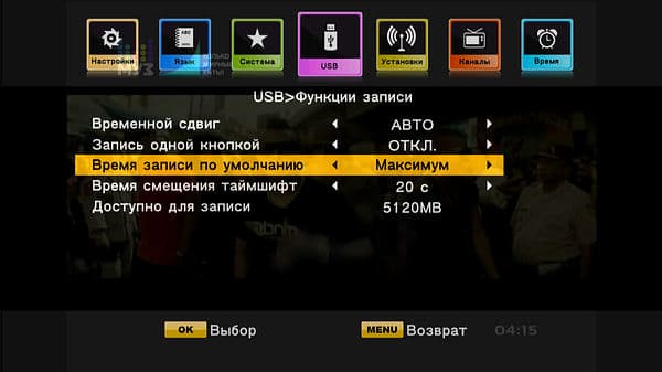 Параметры записи включают в себя настройки режима отложенного просмотра Timeshift (отключен, авто, пауза, время смещения 10, 20 и 30 секунд), включение записи одной кнопкой (при отключении можно выбрать интервал записи, от 15 минут до 24 часов, возможна запись до заполнения накопителя) и отображение доступного для записи места.