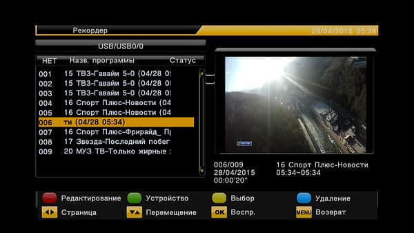 На подключенном накопителе создается папка Myrecord, для каждого записанного фрагмента создается собственная папка с датой и каналом в названии, запись осуществляется в формате TS, при этом создается служебный файл info.rcd.