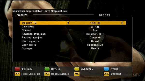 Во время тестирования ресивер смог воспроизвести все файлы наиболее распространенных форматов, не возникло затруднений и с отдельными файлами субтитров, для которых можно настроить не только размер (средний, большой, маленький), цвет текста (белый, черный, красный, синий, зеленый, желтый) и цвет фона (прозрачный, серый, желтый, белый), но и кодировку с расположением.