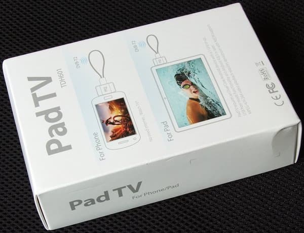 Pad TV TDH601 поставляется в белой коробке со схематическими изображениями TV-тюнера, подключенного к телефону и планшету.