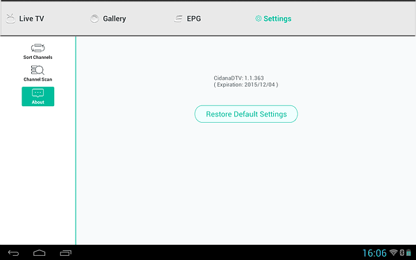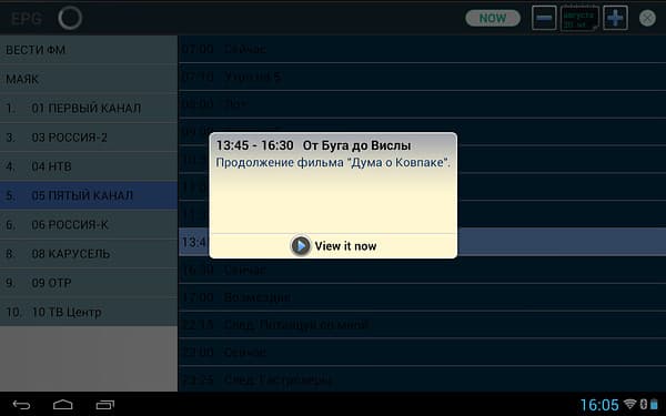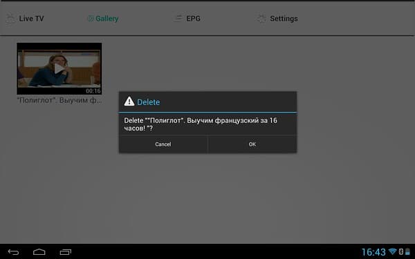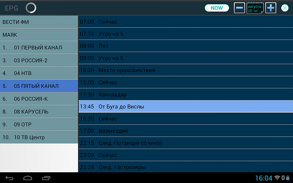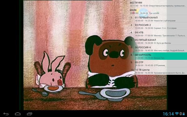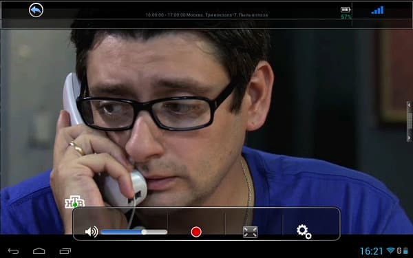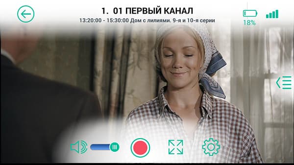 Доступное здесь управление также лаконично, можно настроить громкость, включить запись (осуществляется в sdcard/CidanaDTV/rec в формате Transport Stream), изменить соотношение сторон (только 16:9 и 4:3) и вызвать список каналов в правой части экрана (каналы также переключаются жестами вправо и влево).