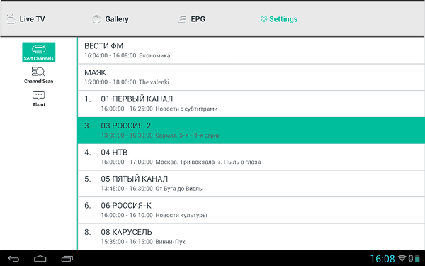 а четвертый отвечает за немногочисленные настройки, по сути сводящиеся к сортировке каналов путем перетаскивания в списке и повторному сканированию.