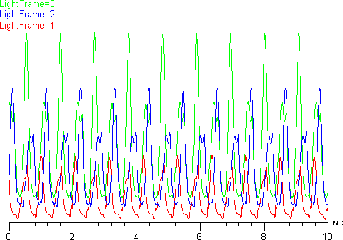 Также мы измерили частоту модуляции подсветки рамки. Ниже приведены зависимости яркости рамки от времени для трех уровней яркости: