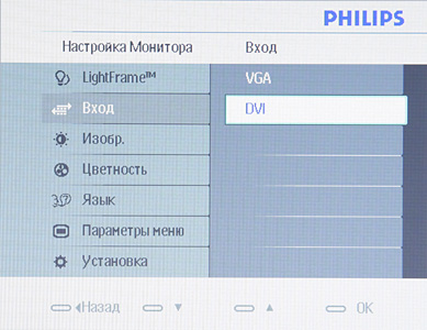 Навигация по меню не очень удобная и подсказки по функциям кнопок совсем не помогают, так как они расположены горизонтально в нижней части меню, а сами кнопки — вертикально на правой кромке. Перечислим функции кнопок, когда на экран не выводится меню (снизу вверх): переключение профилей SmartImage, регулировка подсветки рамки, запуск автоподстройки под VGA-сигнал, переключение между DVI и VGA, переключение форматов, вызов меню. При настройке изображения меню остается на экране, что несколько мешает оценке вносимых изменений.