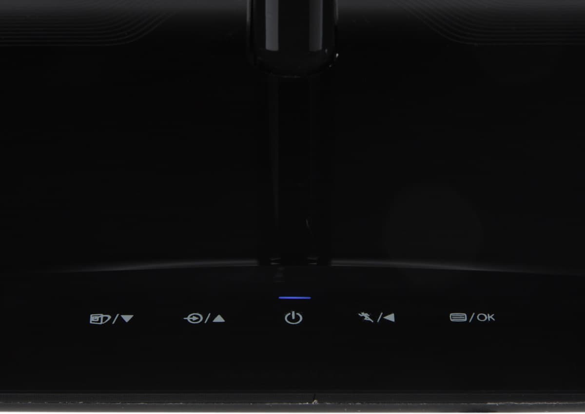 Индикатор питания при работе неярко светится белым (синий на фотографии получился из-за разницы в цветовой температуре между светодиодом индикатора и лампами накаливания в осветительных установках), в режиме ожидания — нечасто мигает и не горит, если монитор выключен. Кнопки сенсорные (ИК?). Места, к которым следует прикладывать палец, обозначены белыми значками. Если на экране нет меню, то нажатие на первую кнопку переключает режимы SmartImage, на вторую — переключает входы, следующая — кнопка питания, четвертая переключает режимы SmartResponse, и последняя выводит меню на экран. Навигация по меню относительно удобная. При настройке изображения меню с экрана убирается, и ползунки параметров выводятся в нижней части экрана, что облегчает оценку вносимых изменений.