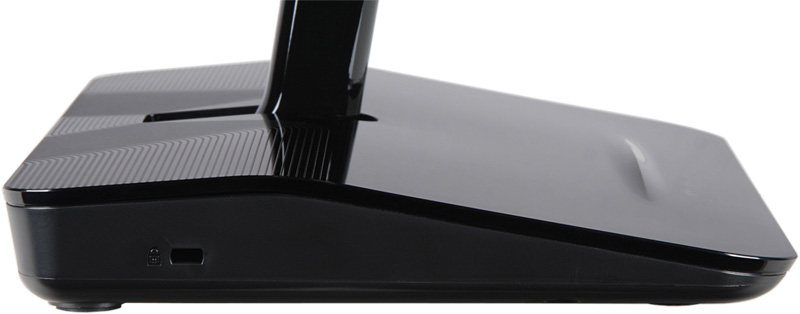 В результате отходящие кабели идут непосредственно от подставки, а не свешиваются неопрятным пучком, и подключенный монитор смотрится очень аккуратно — останется только для баланса не загромождать окружающую монитор рабочую поверхность. Четыре резиновые ножки-таблетки надежно фиксируют монитор на столе, а относительно большая площадь основания обеспечивает монитору хорошую устойчивость. Стойка намертво приделала к блоку экрана, а на основании подставки закреплена через шарнир, который позволяет немного наклонять блок экрана вперед от вертикального положения, больше — назад, а также поворачивать основание подставки почти параллельно блоку экрана, чтобы в таком виде упаковывать монитор в коробку.