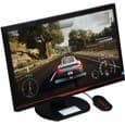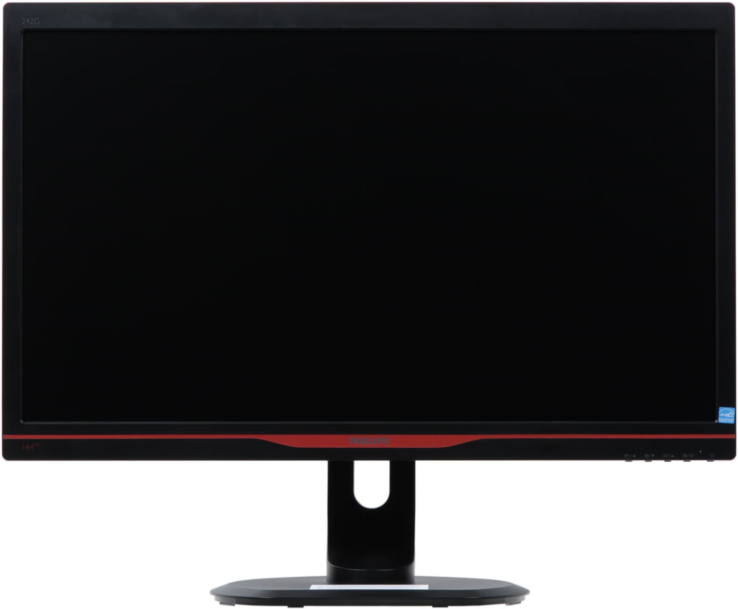 Сразу отметим, что дизайн нам понравился, вроде бы ничего экстраординарного, но смотрится монитор хорошо, да и с эргономикой у него все более-менее в порядке. Внешние панели монитора, включая рамку вокруг экрана и подставку, изготовлены из черного пластика с матовой поверхностью, при этом часть задней панели имеет фактуру поверхности в виде решетки из мелких шестиугольников. Внешняя поверхность матрицы матовая, черная и относительно жесткая. Декоративная красная вставка в нижней части фронтальной рамки удачно оттеняет логотип и вообще отторжения не вызывает. На нижнем торце ближе к правому углу находятся пять кнопок управления.