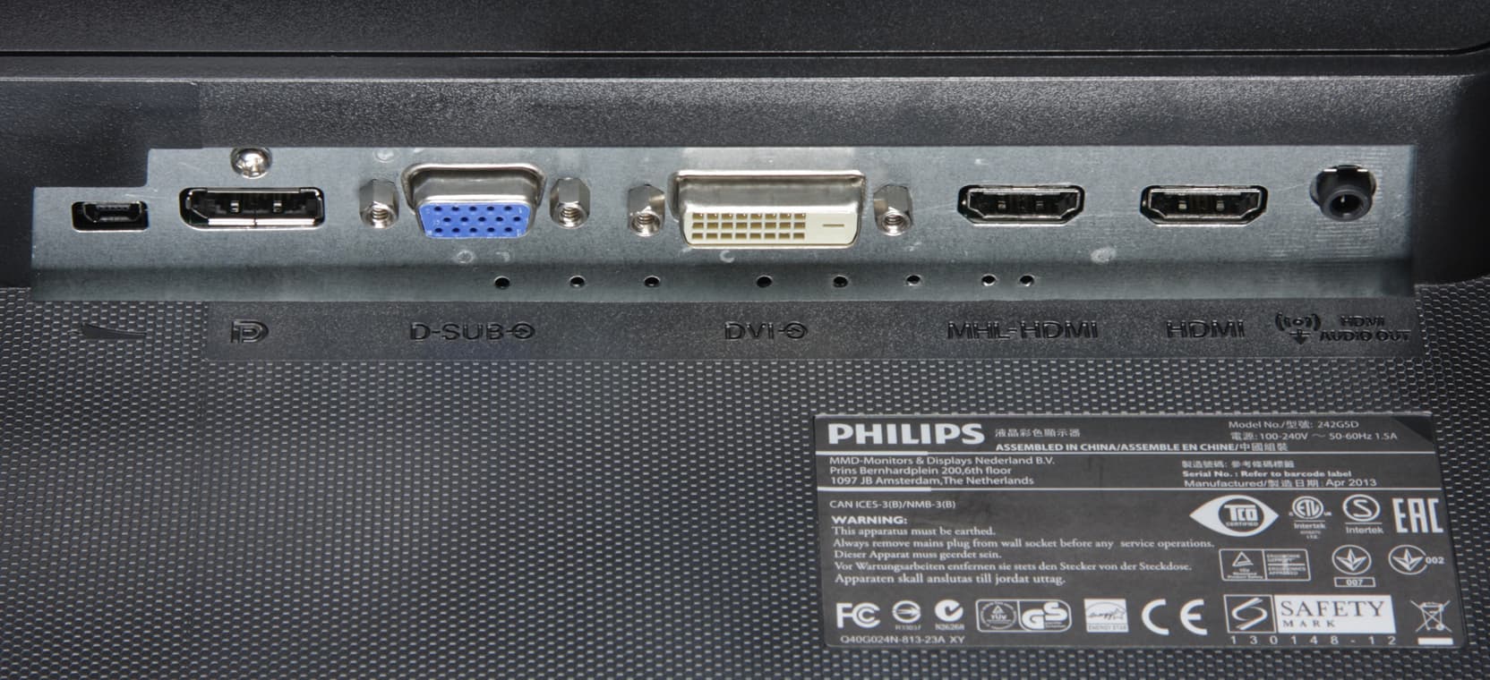 Монитор оснащен пятью входами: DisplayPort, парой HDMI, DVI-D(DL) и VGA. Один из входов HDMI поддерживает MHL (до 1080p при 30 кадр/с), однако приложить соответствующий кабель производитель поскупился, что резко снижает ценность такой универсальности, так как проще купить сразу адаптер MHL на HDMI. Есть режим с автоматическим поиском активного входа. Ручной выбор входа осуществляется кнопкой на рамке или в меню.