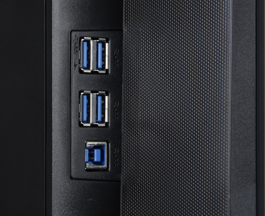 Входы HDMI и DisplayPort способны принимать цифровые аудиосигналы (только PCM-стерео), которые выводятся после преобразования в аналоговый вид через гнездо миниджек 3,5 мм. К этому гнезду можно подключить внешнюю активную акустическую систему или наушники. Мощности выхода на наушники хватило, чтобы в 32-омных наушниках громкость была достаточной, и даже с небольшим запасом. Качество звука в наушниках высокое — звук чистый, воспроизводятся все частоты, в паузах шума не слышно. Один из четырех выходных USB-портов, который со значком молнии, имеет повышенную нагрузочную способность. Его можно использовать, например, для ускоренной зарядки мобильных устройств, если, конечно, устройство сможет распознать возможность увеличения тока зарядки.