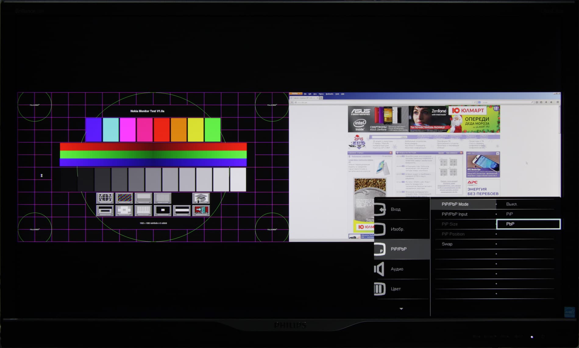 Режимов геометрической трансформации два: Широкоэкранный — изображение растягивается на весь экран и 4:3 — вывод в указанном формате с растяжением до горизонтальных границ экрана. При активации режима Over Scan картинка немного увеличивается, так что по периметру чуть-чуть обрезается. Есть функция отображения картинки от двух источников сразу в виде пары основное окно во весь экран и маленькое в углу или двух изображений в двух (правой и левой) половинах экрана. Во втором случае можно получить две картинки рядом с разрешением 1920 на 1080 пикселей в режиме точка в точку.