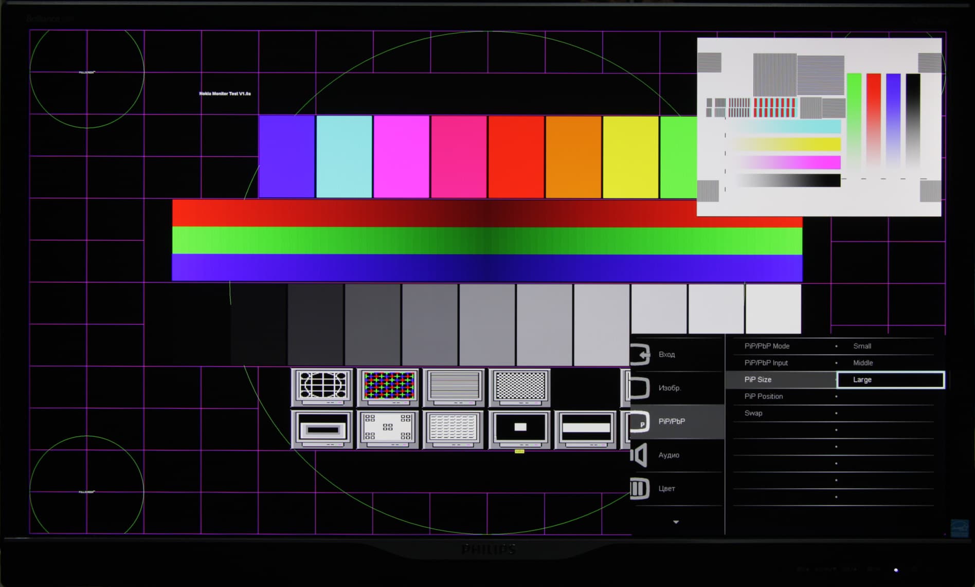 Для VGA-подключения максимум — это 1920 на 1080 при 60 кадр/с. Подстройка под параметры VGA-сигнала на удобных изображениях выполняется быстро и точно. При этом виде подключения есть небольшой неустранимый завал в светах. При HDMI- и DVI-подключении поддерживается разрешение до 3840 на 2160 пикселей включительно, но только при 30 Гц кадровой частоты. Кино смотреть можно, работать нельзя. При подключении по DisplayPort максимальная частота при таком разрешении увеличивается до комфортных 60 Гц кадровой частоты. Несмотря на заявления производителя о поддержке отображения 1,07 млрд оттенков, в случае DisplayPort (в режиме 1.2) и профессиональной видеокарты мы не получили 10 бит на цвет, только 8. В случае цифровых способов подключения различаются все градации оттенков на шкале серого, но для сигналов меньших 3840 на 2160 пикселей приходится вручную выбирать правильный уровень черного (настройка Black level), иначе он завышен, и вместо черного на экран выводится темно-серый.