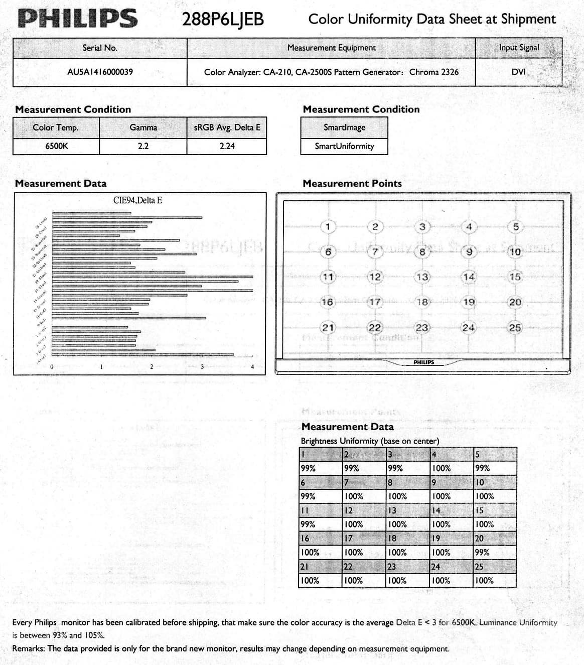 Отметим, что производитель заявляет, что каждый монитор проходит заводскую калибровку, и в доказательство прилагается соответствующий отчет: