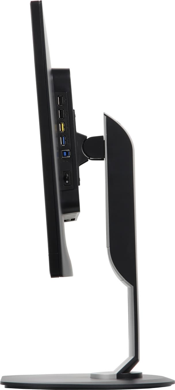 Сами кнопки сенсорные и расположены, видимо, примерно под значками. Крохотный глазок индикатора состояния находится в ряду кнопок перед кнопкой питания. Все интерфейсные разъемы и разъем питания расположены на торцах выступа сзади. На нижнем торце — разъем питания, видео- и аудиоинтерфейсы, на правом (если смотреть на монитор спереди) — вход и выходы концентратора USB и клавиша питания. Подключать кабели к монитору относительно удобно, особенно при перевороте блока экрана в портретную ориентацию. Кроме того, на задней панели можно обнаружить разъем для кенсингтонского замка.