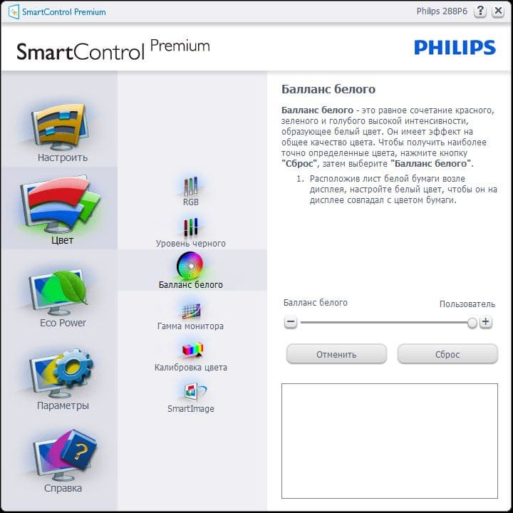 Цветовой баланс регулируется или выбором предустановленного профиля с определенной цветовой температурой, или ручной регулировкой интенсивностей трех цветов, а при выборе варианта sRGB монитор по версии производителя должен наилучшим образом соответствовать стандартным требованиям.