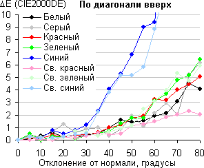 Для количественной характеристики изменения цветопередачи мы провели колориметрические измерения для белого, серого (127, 127, 127), красного, зеленого и синего, а также светло-красного, светло-зеленого и светло-синего полей во весь экран с использованием установки, подобной той, что применялась в предыдущем тесте. Измерения проводились в диапазоне углов от 0° (датчик направлен перпендикулярно к экрану) до 80° с шагом в 5°. Полученные значения интенсивностей были пересчитаны в ΔE относительно замера каждого поля при перпендикулярном положении датчика относительно экрана. Результаты представлены ниже: