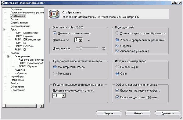 Раздел Отображение позволяет включить экранное меню (OSD), деинтерлейс, масштабирование, выбрать соотношение сторон, устройство вывода (монитор или телевизор) и режим работы по умолчанию (полноэкранный или оконный).