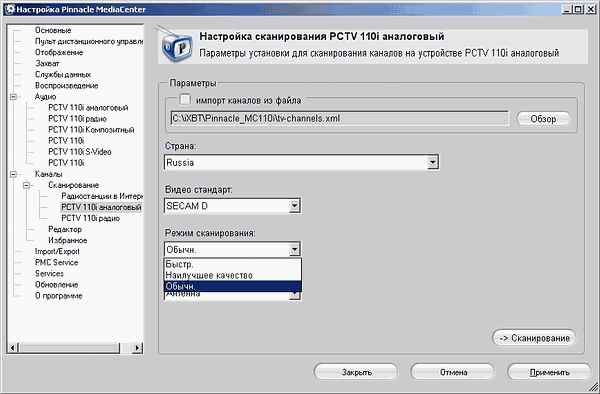 Имеются три режима поиска каналов. Как и все полупроводниковые тюнеры, в этой части TDA8275A проявляет себя с самой лучшей стороны — даже быстрое сканирование позволило обнаружить все мои каналы. О качестве мы поговорим ниже.