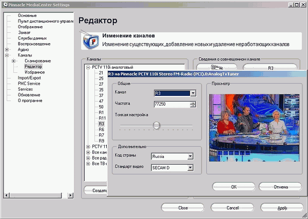- Индивидуальная настройка частоты и стандарта цветности для каждого канала