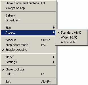 Кроме этого, по правой кнопке мыши вызывается контекстное меню, с помощью которого, в частности, доступны отключение бордюра вокруг видеоокна (горячая клавиша F3 или двойной щелчок на главном окне), смена пропорций (4:3/16:9/ручная настройка), функция масштабирования Zoom и опция подгонки изображения Cropping, позволяющая избавиться от «мусора» сверху и снизу изображения.