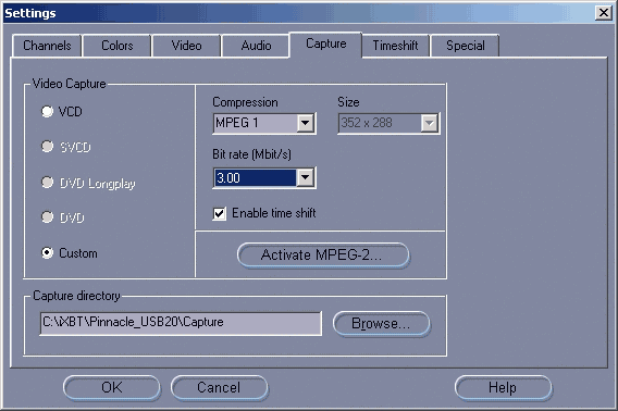 Неприятной особенностью является необходимость платной (!) активации кодека для записи в MPEG-2. 5$ за регистрацию не являются значительной суммой, но для многих российских потребителей это может стать чисто технической проблемой. Поддерживаются только форматы MPEG-1, MPEG-2 (после активации) и DV. Поддержка MPEG4 и других установленных в системе кодеков отсутствует. Возможно, объяснение этому факту кроется в снисходительном отношении разработчика к сторонним кодекам. Из дополнительных параметров доступны битрейт и выбор разрешения. При отсутствии активации кодека, для работы Timeshift используется MPEG-1 с разрешением 352×288. Впрочем, полученного таким образом качества должно хватить для большинства ситуаций.