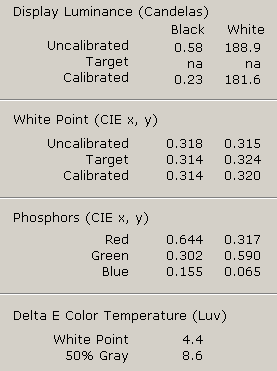 При яркости (засветке) черного цвета в 0.58Кд для достижения паспортного соотношения 600:1 матрице необходимо иметь яркость белого почти в 350 Кд. Однако в наличие есть лишь 188. Поэтому реальная контрастность имеет коэффициент 325:1, что в целом тоже неплохо. Хотя далеко не рекорд (вспомним PVA с фактическим 1000:1).