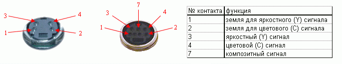 Рис.2. Слева — 4-х контактный разъём S-Video, справа — 7-ми контактный. Цифрами обозначены номера контактов. Схема для 7-ми контактного разъёма приведена для карт RADEON.