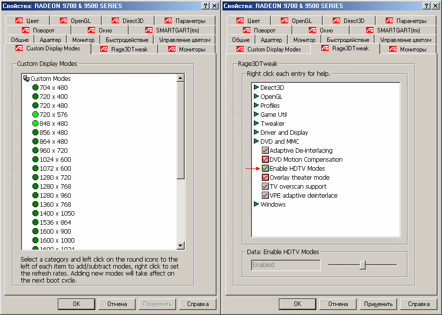 На рисунке выше показаны настройки Rage3Dtweak, которые требуются для включения нестандартных разрешений. Для этого вам может потребоваться поставить галочку напротив опции «Enable HDTV TV Modes» (на рис.18 отмечено стрелкой на правой картинке). Для включения требуемого разрешения выберите его из списка «Custom Modes» и нажмите зелёную кнопку слева от выбранного разрешения, после чего сохраните настройки (нажав кнопку «Применить» или «OK») и перезагрузитесь. Новые режимы должны будут появиться в свойствах дисплея.