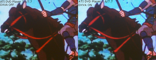 Разница видна невооружённым глазом (в обоих случаях применялся weave деинтерлейсинг). В ATI DVD Player 7.8 такой проблемы нет, но включить использование DirectX VA в этом проигрывателе более проблематично, чем в предыдущих версиях (используется другой «движок», записи в реестре Windows тоже другие), в PowerDVD XP 4.0 и WinDVD 4.0 такой проблемы также не было замечено. На рисунке ниже показан процесс включения/выключения использования DirectX VA проигрывателем ATI версий 7.6 и 7.7: