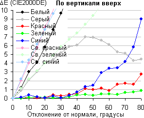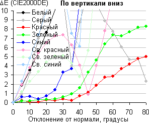 Для количественной характеристики изменения цветопередачи мы провели колориметрические измерения для белого, серого (127, 127, 127), красного, зеленого и синего, а также светло-красного, светло-зеленого и светло-синего полей во весь экран с использованием установки, подобной той, что применялась в предыдущем тесте. Измерения проводились в диапазоне углов от 0° (датчик направлен перпендикулярно к экрану) до 80° с шагом в 5°. Полученные значения интенсивностей были пересчитаны в ΔE относительно замера каждого поля при перпендикулярном положении датчика относительно экрана. Результаты представлены ниже: