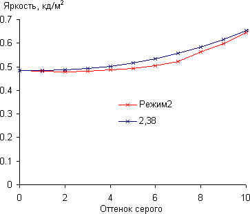 Можно считать, что такой минимальный завал в тенях практически не сказывается на качестве изображения. А при взгляде под небольшим углом сверху и этот завал в тенях исчезает. Аппроксимация полученной гамма-кривой дала показатель 2,38, что выше стандартного значения 2,2, поэтому изображение слегка затемнено. При этом аппроксимирующая показательная функция заметно отклоняется от реальной гамма-кривой: