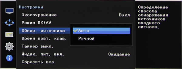 При настройке изображения меню остается на экране, что немного мешает оценке вносимых изменений. Можно выключить слабую прозрачность фона, установить тайм-аут автоматического выхода из меню и настроить режим повтора при удерживании кнопки. Присутствует таймер на выключение (1—23 часа). Есть русская версия экранного меню.