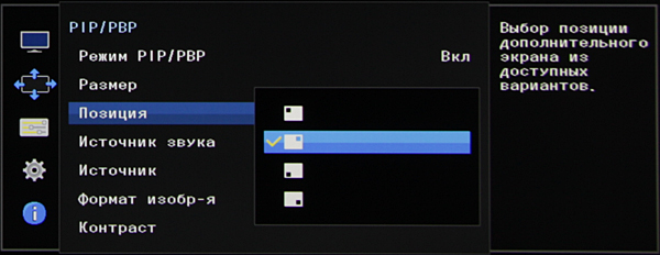Режимов геометрической трансформации два: можно или сохранить исходные пропорции изображения (Авто), вписав его в экран до ближайших границ (на практике до горизонтальных, и пропорции считаются по пикселям, поэтому картинка 4:3 PAL или NTSC слегка искажается), или принудительно растянуть на весь экран (Широкий). Для каждого входа в отдельности можно включить режим AV, в котором картинка немного увеличивается так, что по периметру выходит за границы области отображения. Есть функция отображения картинки от двух источников сразу в виде пары основное окно во весь экран и маленькое в углу или двух изображений в двух (правой и левой) половинах экрана.