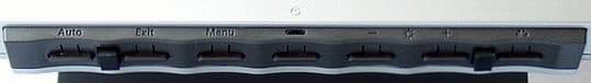 Кнопки управления работой монитора достаточно миниатюрны. Они расположены на нижнем ребре корпуса. На фото можно увидеть два прямоугольника, расположенные среди кнопок, это не что иное, как ножки из твердой резины. Дело в том, что в крайнем нижнем положении монитор фактически упирается нижним ребром в поверхность стола, а эти ножки предотвращают случайное нажатие кнопок. Небольшой размер кнопок и их скрытое расположение иногда вызывает определенные затруднения, если при настройке необходимо найти ту или иную кнопку.
